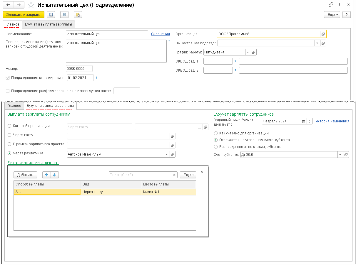 - На закладе «Бухучет и выплата зарплаты» можно уточнить для подразделения способ выплаты зарплаты, установив переключатель в нужное положение: «Через кассу», «Зачисляем на карточку», «Через раздатчика». Тогда будет считаться, что всем сотрудникам этого подразделения зарплата выплачивается другим способом, отличным от способа выплаты всей организации. По умолчанию устанавливается переключатель в положение «Как всей организации» (рис. 2). В разделе «Бухучет зарплаты сотрудников» можно указать способ отражения зарплаты сотрудников подразделения в бухгалтерском учете, например, установите переключатель в положение «Отражается на указанном счете, субконто» и в поле «Счет, субконто» укажите соответствующий способ отражения расходов на оплату труда или установите переключатель «Распределяется по счетам, субконто», если необходимо распределить по нескольким способам отражения расходов труда в заданных долях. По умолчанию устанавливается переключатель в положение «Как указано для организации». Эти настройки имеет смысл редактировать, если они отличаются от аналогичных настроек, принятых по организации в целом.